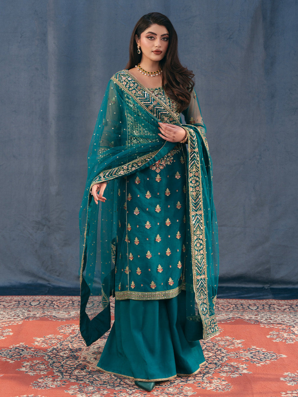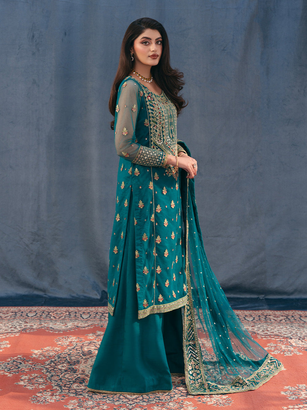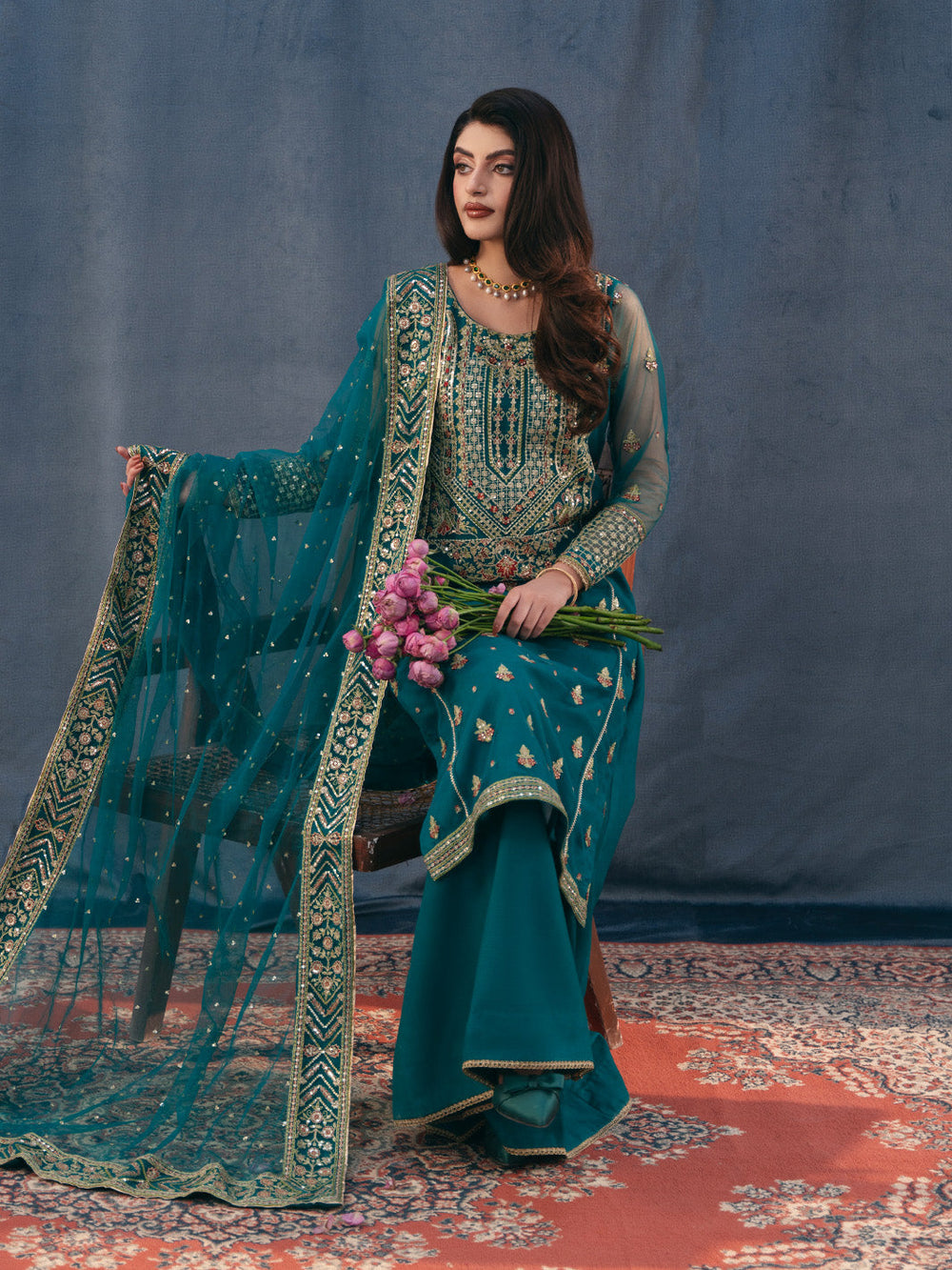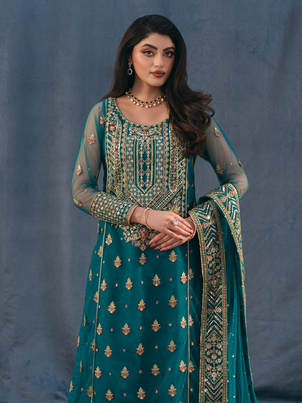 Shirt: Made of net fabric, the shirt is adorned with intricate embroidery in gold and subtle embellishments, giving it a regal and luxurious look.