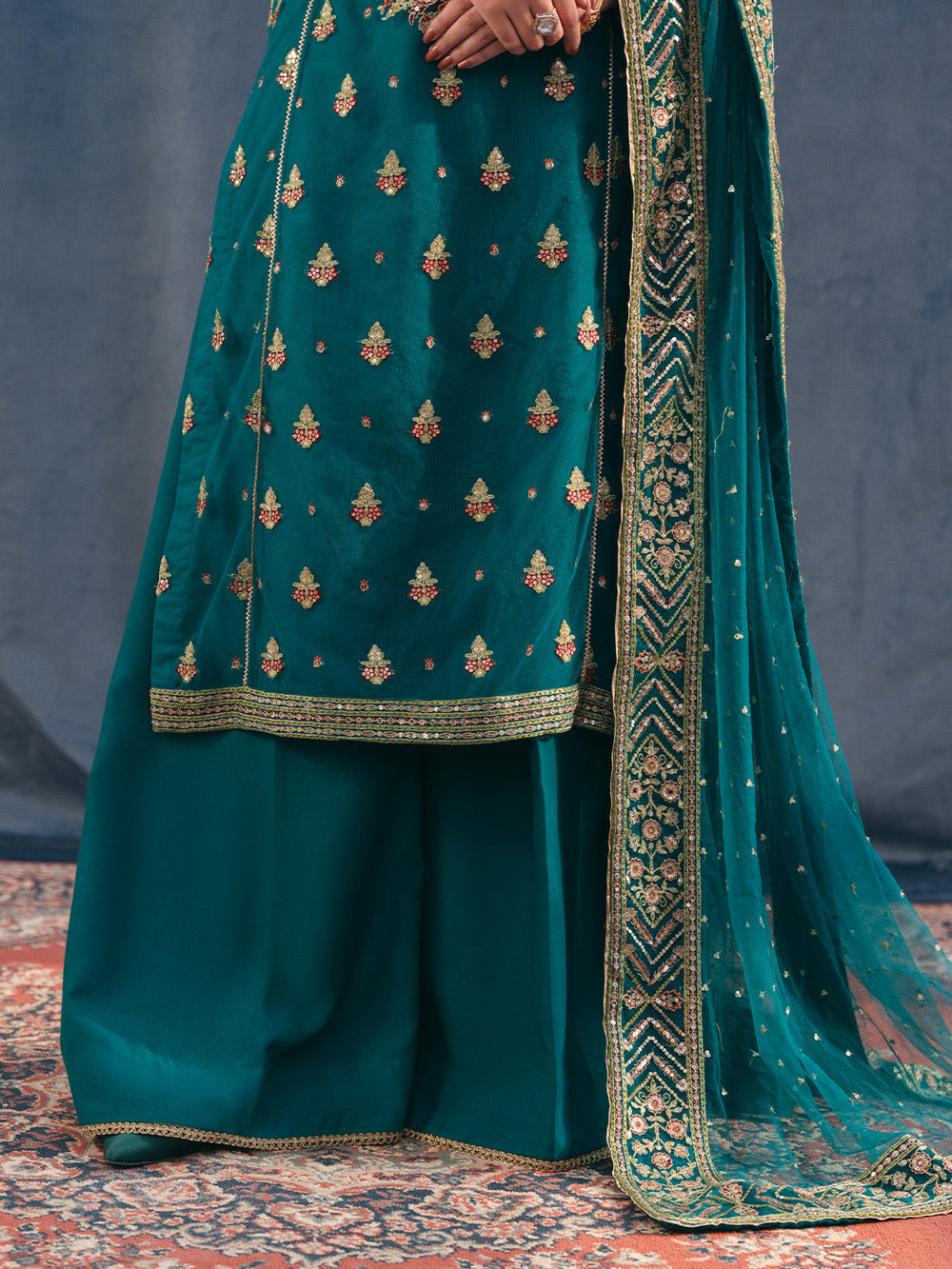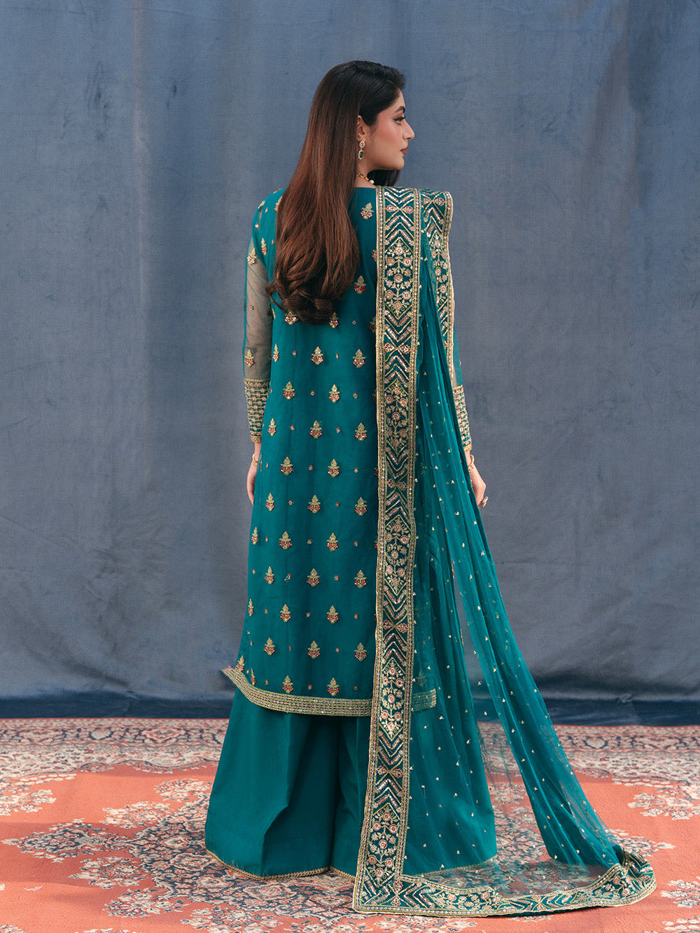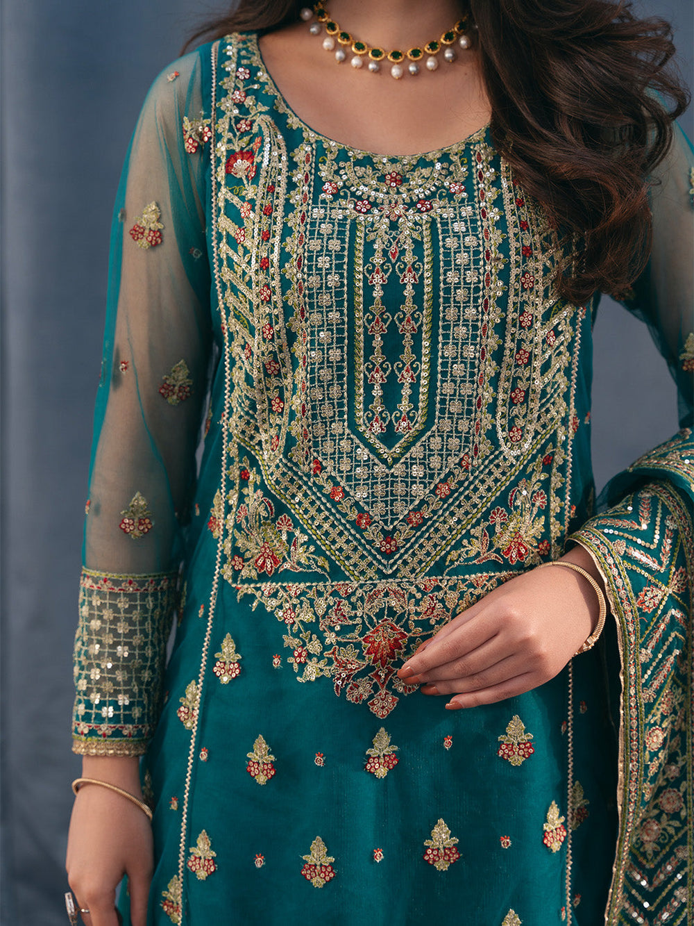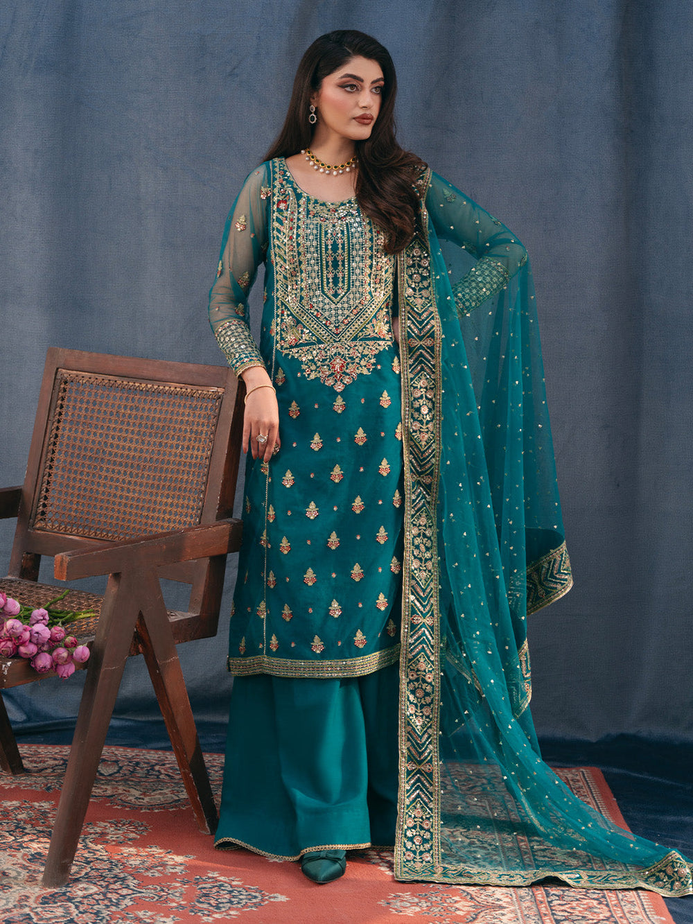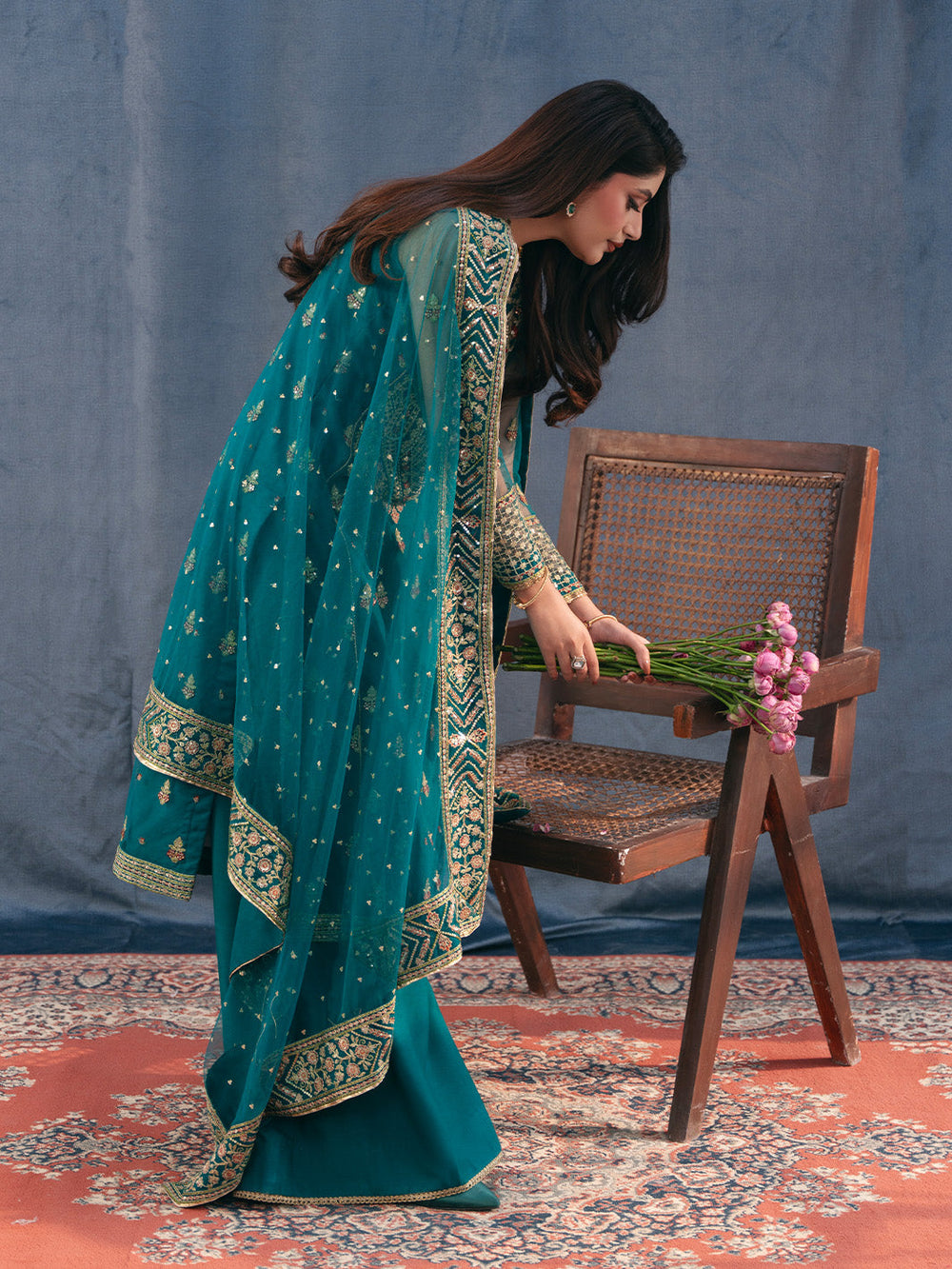 Shirt: Made of net fabric, the shirt is adorned with intricate embroidery in gold and subtle embellishments, giving it a regal and luxurious look.