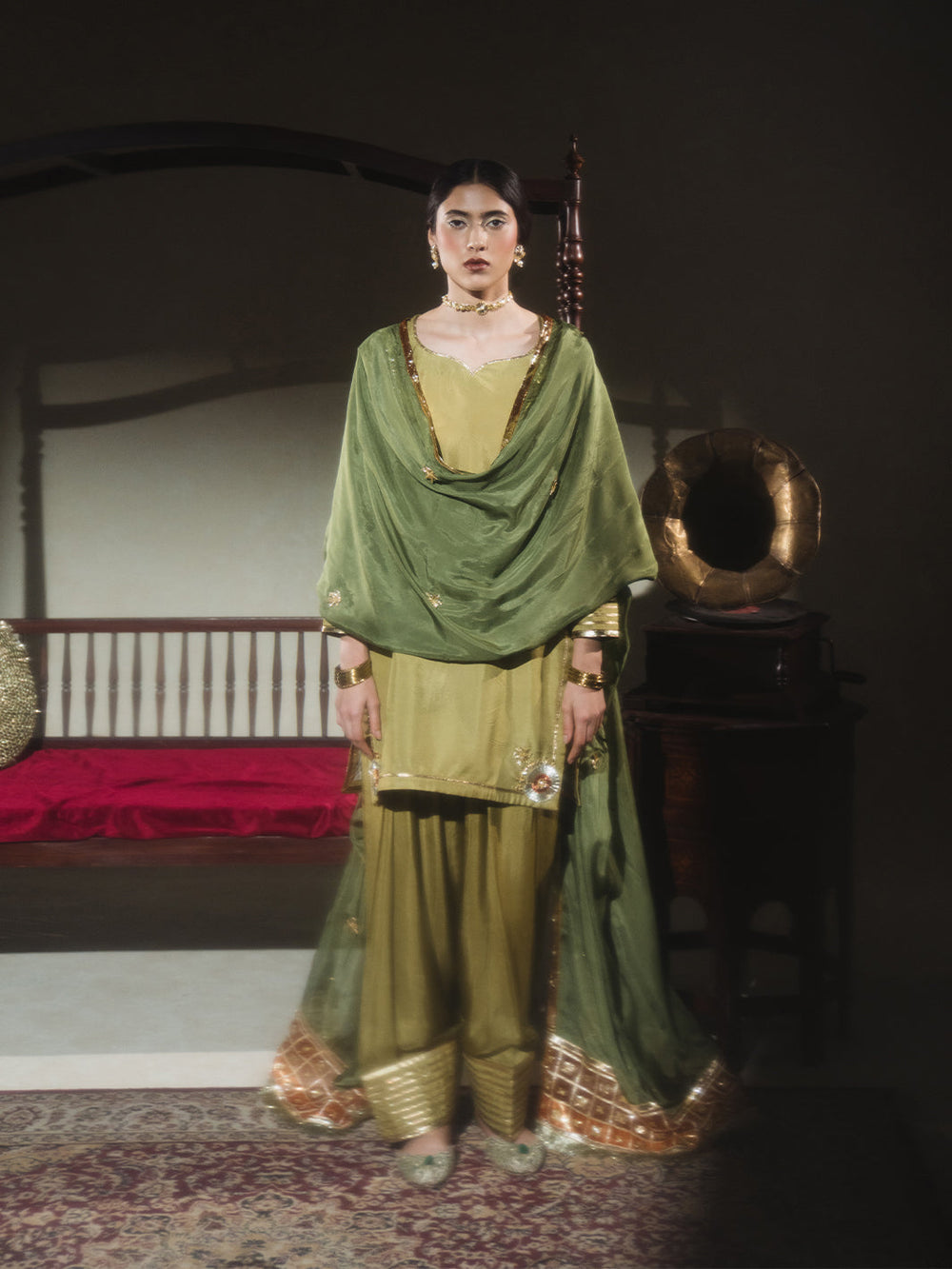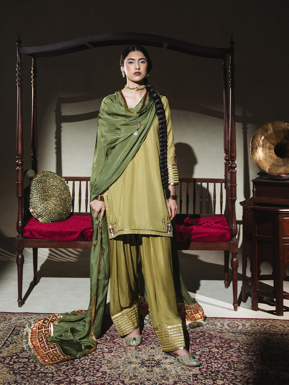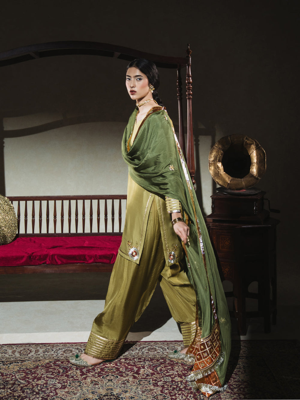 A soft zaitooni grip fabric kurti paired with a classic farshi shalwar, both detailed with subtle gota work and finished with traditional cuts. The kurti features a diya neckline and champak-inspired gota patti motifs, while the farshi shalwar adorned with gota kinariĀ pauncha. The look comes together with a kaayi sabz silk dupatta, designed with a contrasting narangi organza pallu, barfi-shaped gota accents, and a sunehri kiran border ā understated, festive, and full of old-world charm.