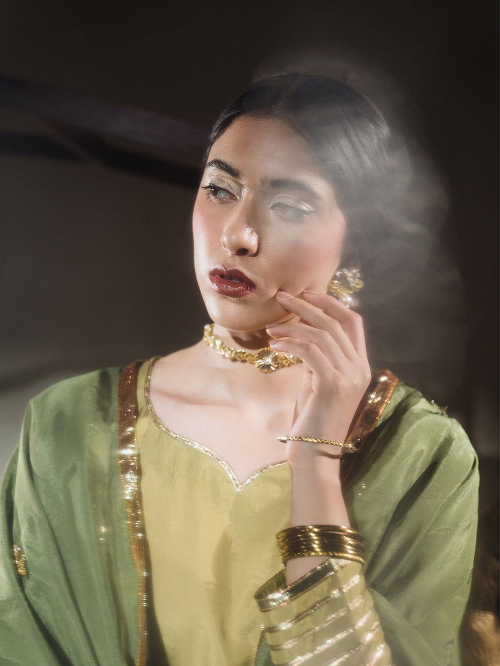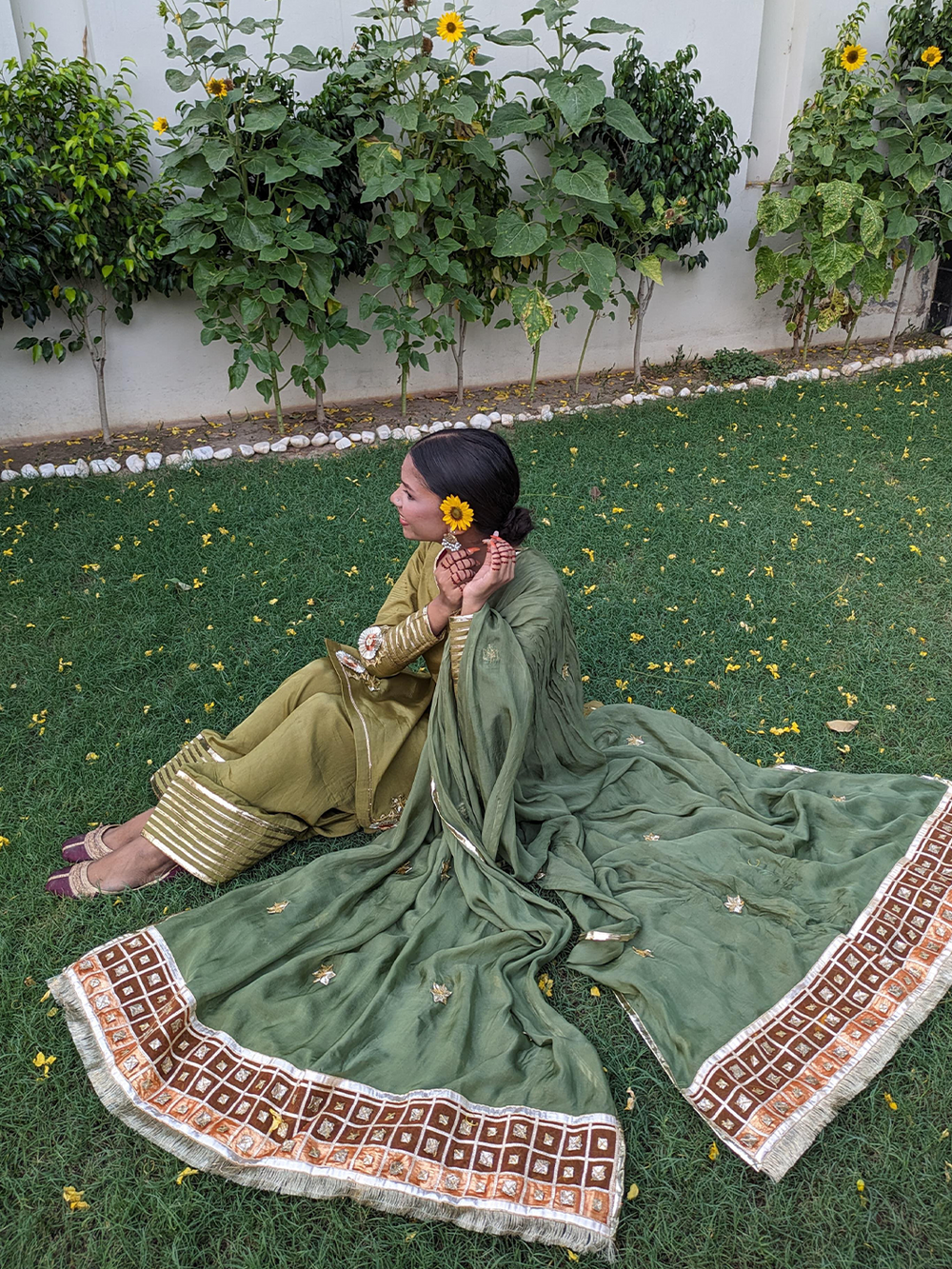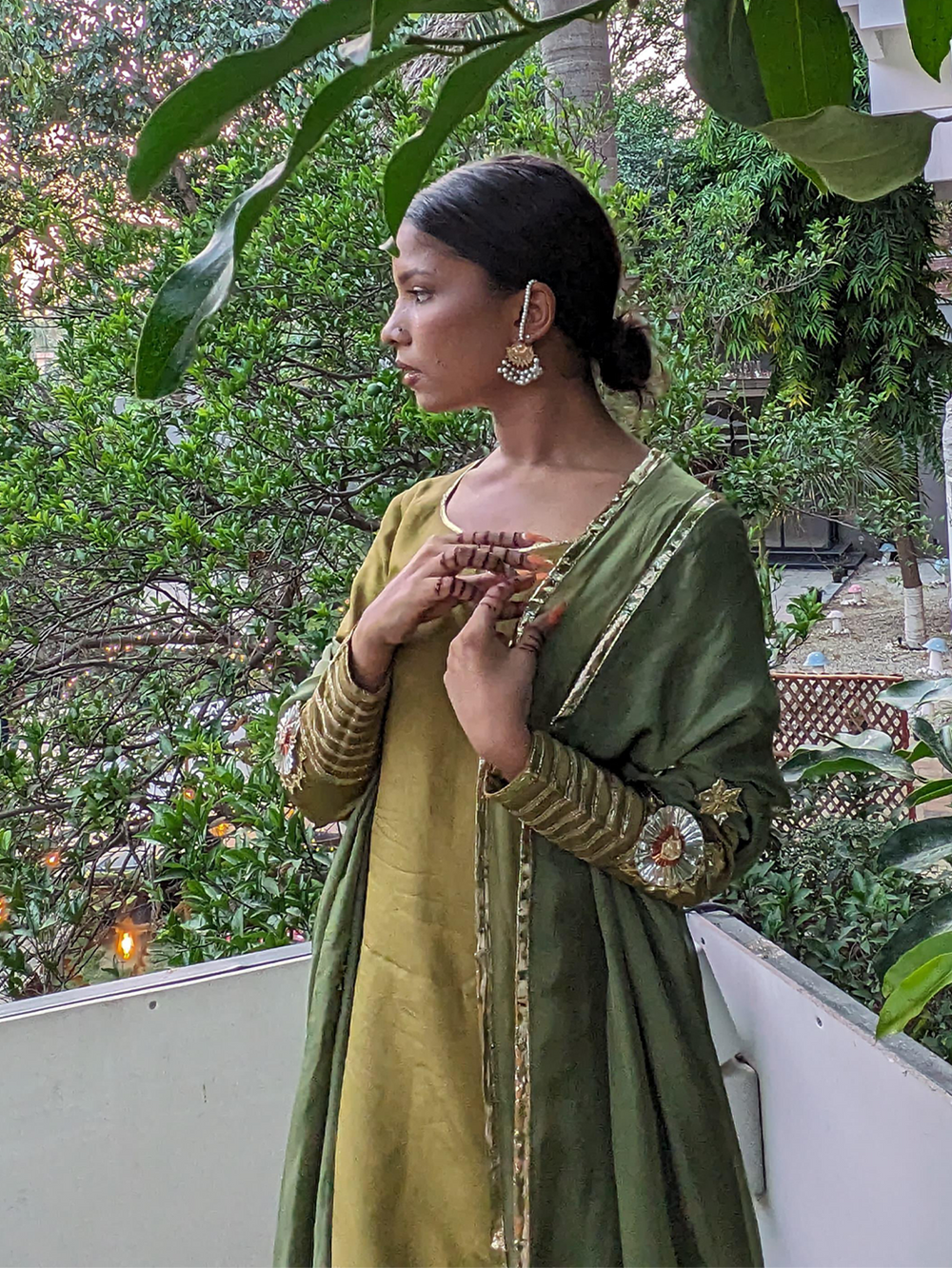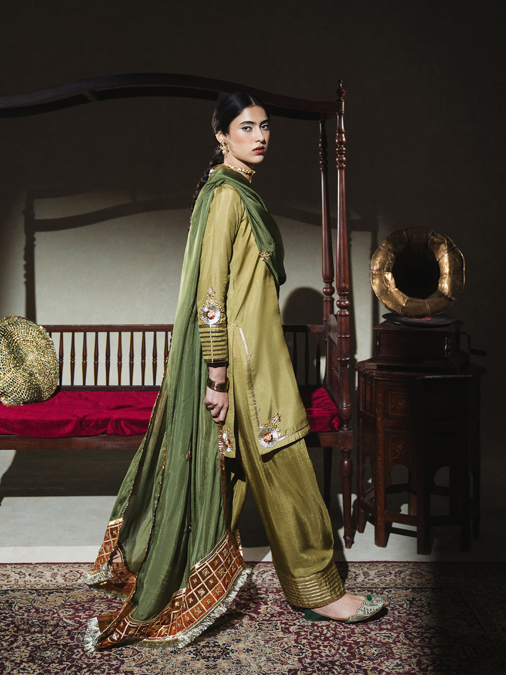 A soft zaitooni grip fabric kurti paired with a classic farshi shalwar, both detailed with subtle gota work and finished with traditional cuts. The kurti features a diya neckline and champak-inspired gota patti motifs, while the farshi shalwar adorned with gota kinariĀ pauncha. The look comes together with a kaayi sabz silk dupatta, designed with a contrasting narangi organza pallu, barfi-shaped gota accents, and a sunehri kiran border ā understated, festive, and full of old-world charm.