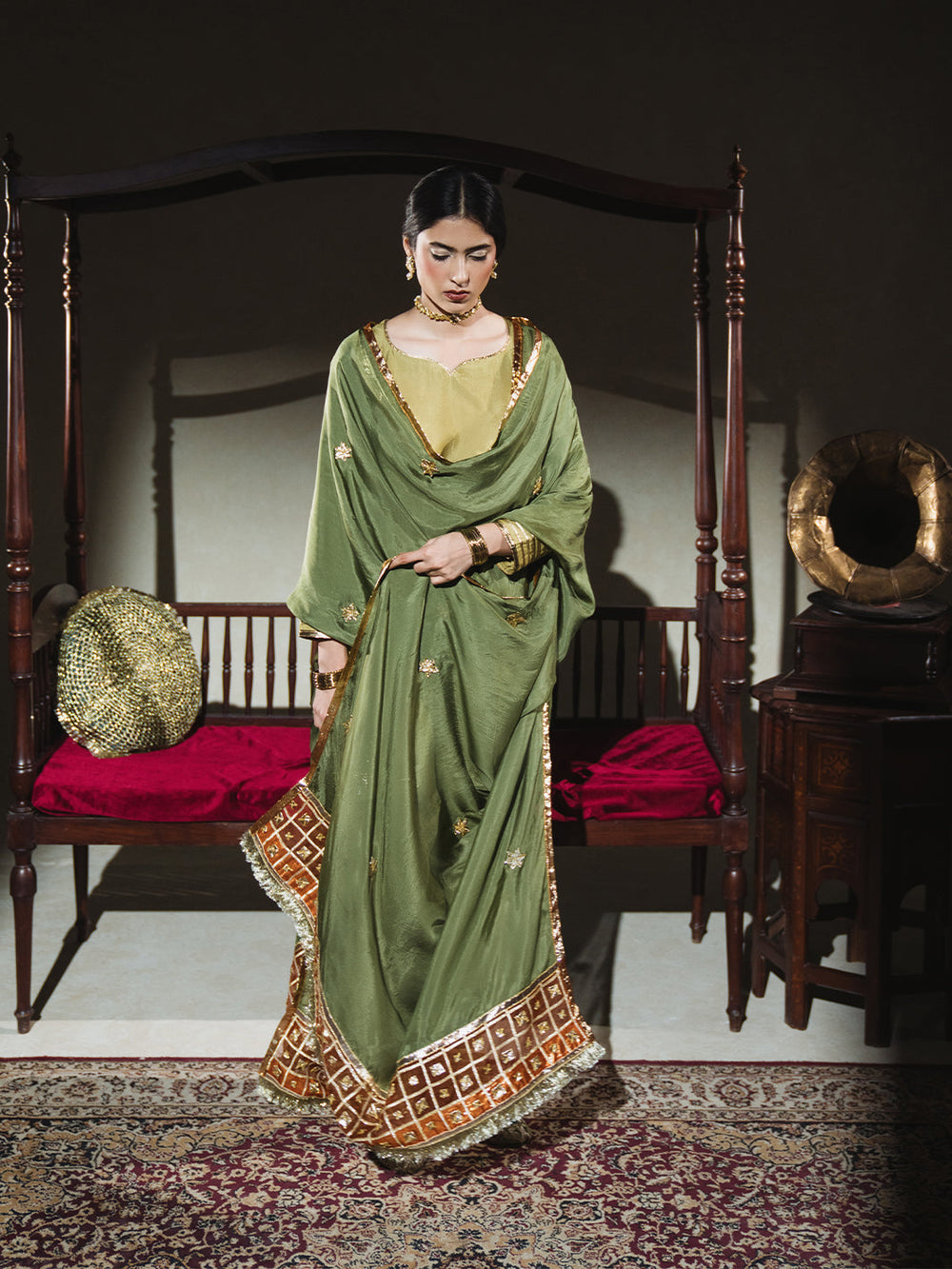 Dupatta: A rich kaayi sabz medium silk dupatta draped with ease, designed with a statement narangi organza pallu. The ends are decorated with barfi-shaped gota squares and trimmed with soft sunehri kiran, catching light with every step.