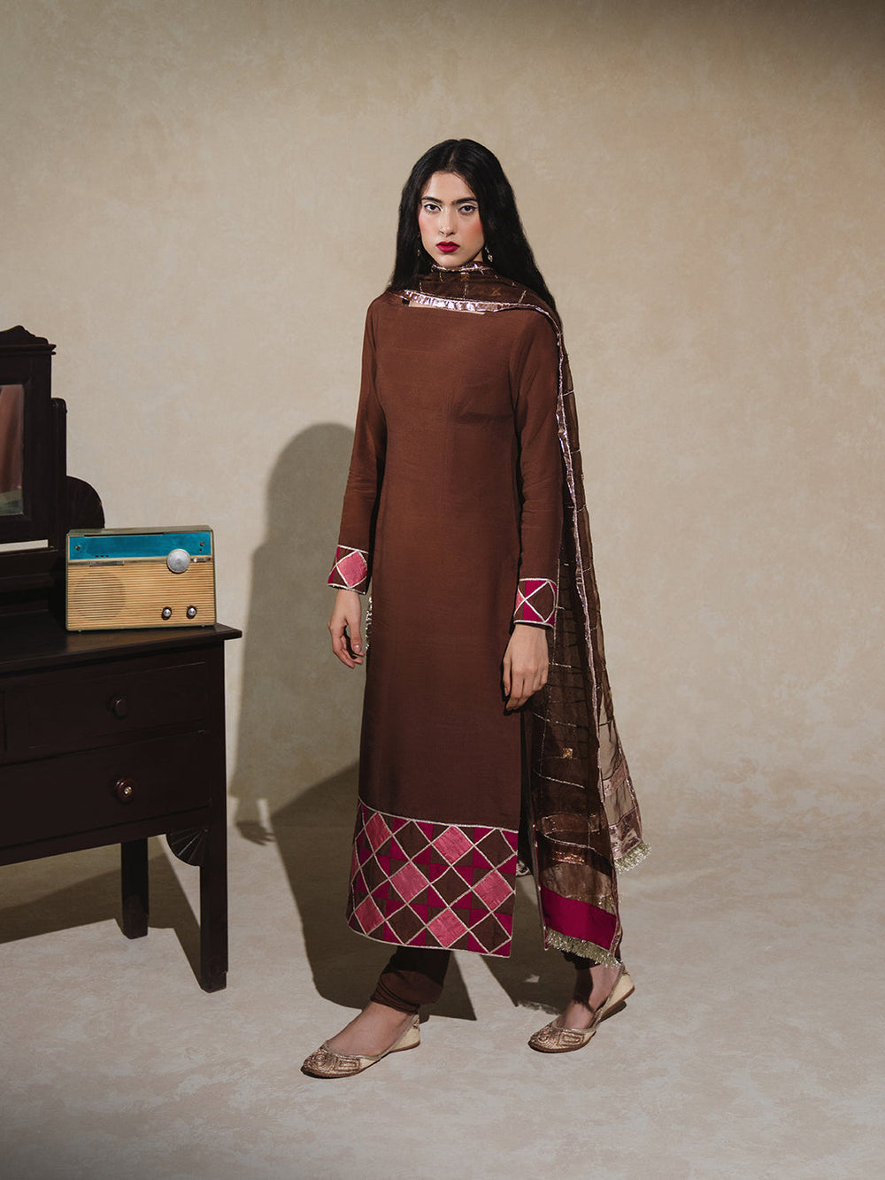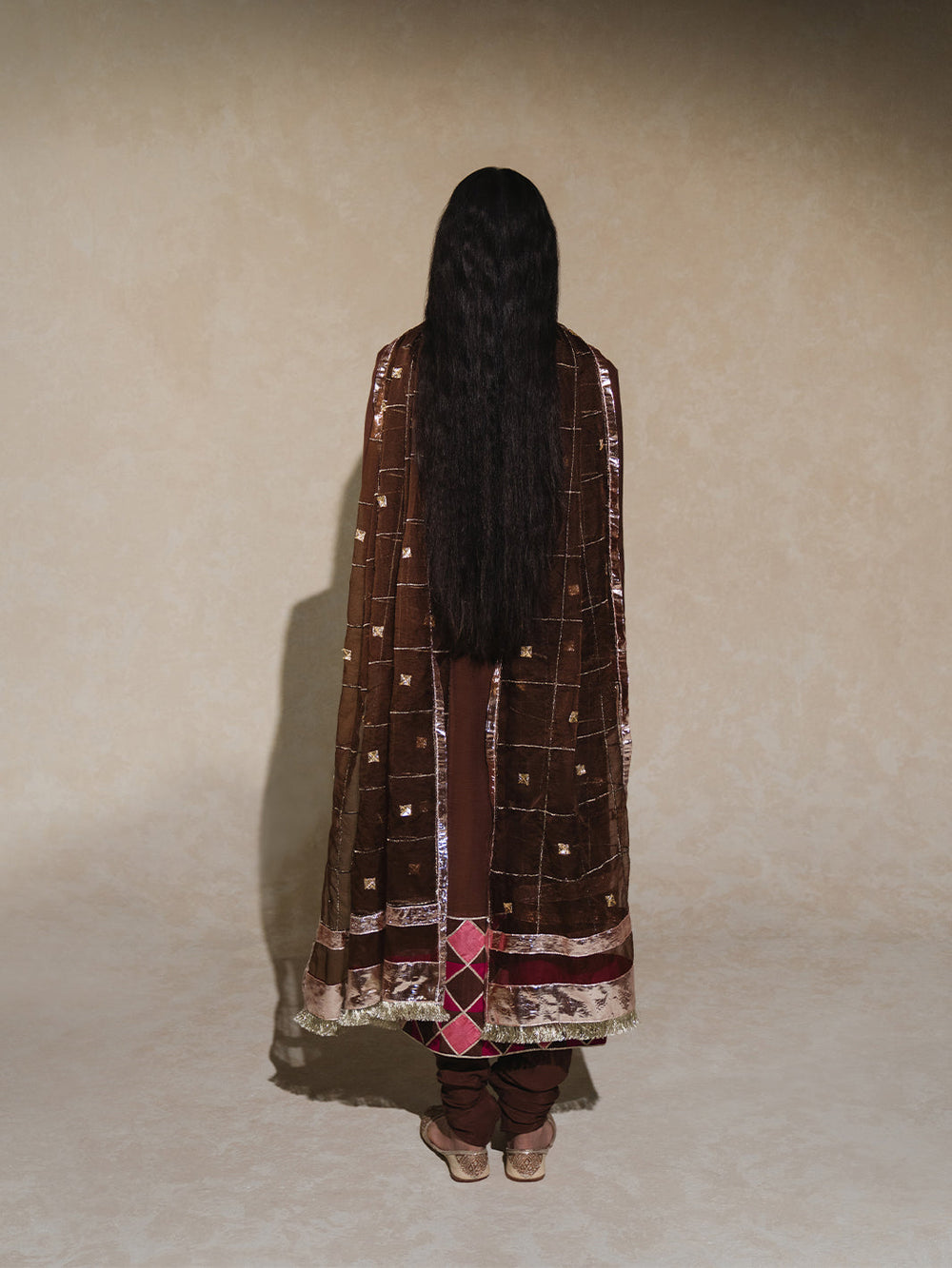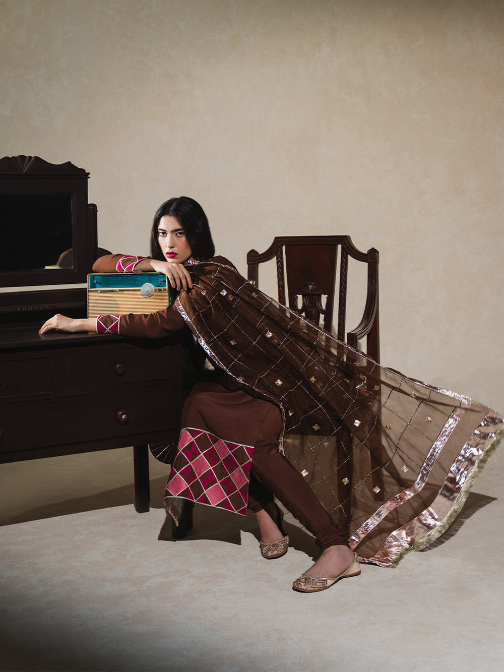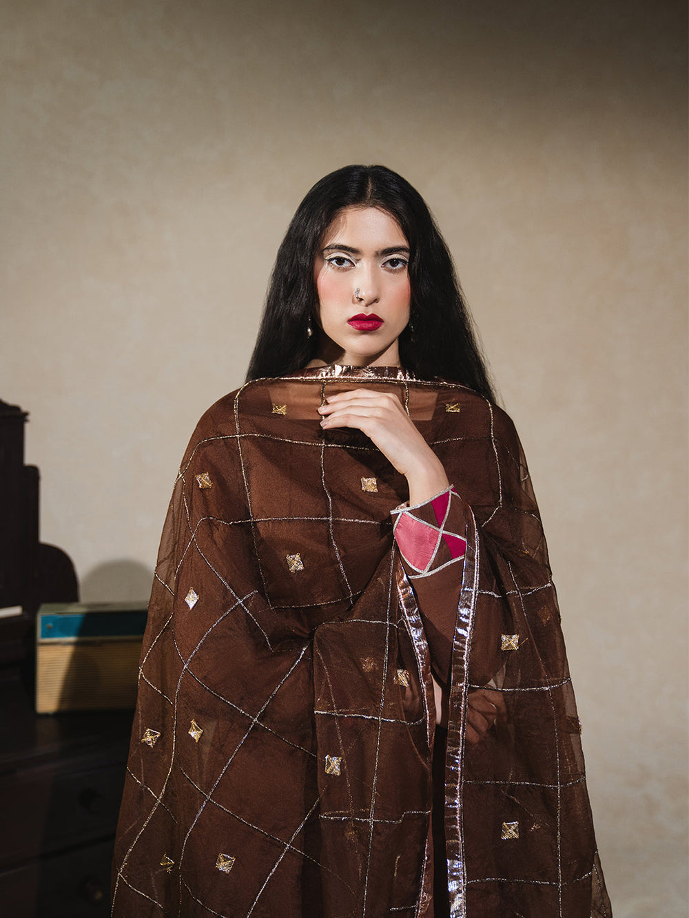 A deep jaiphal brown raw silk kameez with a choras neckline and long, structured cut, finished with hot pink barfi-style tukri gota in a chattapati-inspired layout along the daman and sleeves. Paired with a classic raw silk chooridar for a timeless, elegant silhouette. The look is tied together with a matching tillaydar organza dupatta, adorned with chikour embroidery, gulabi kinari, and chandni kiran — soft, nostalgic, and made to be remembered.