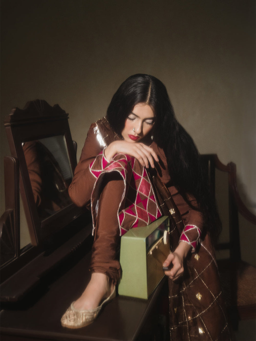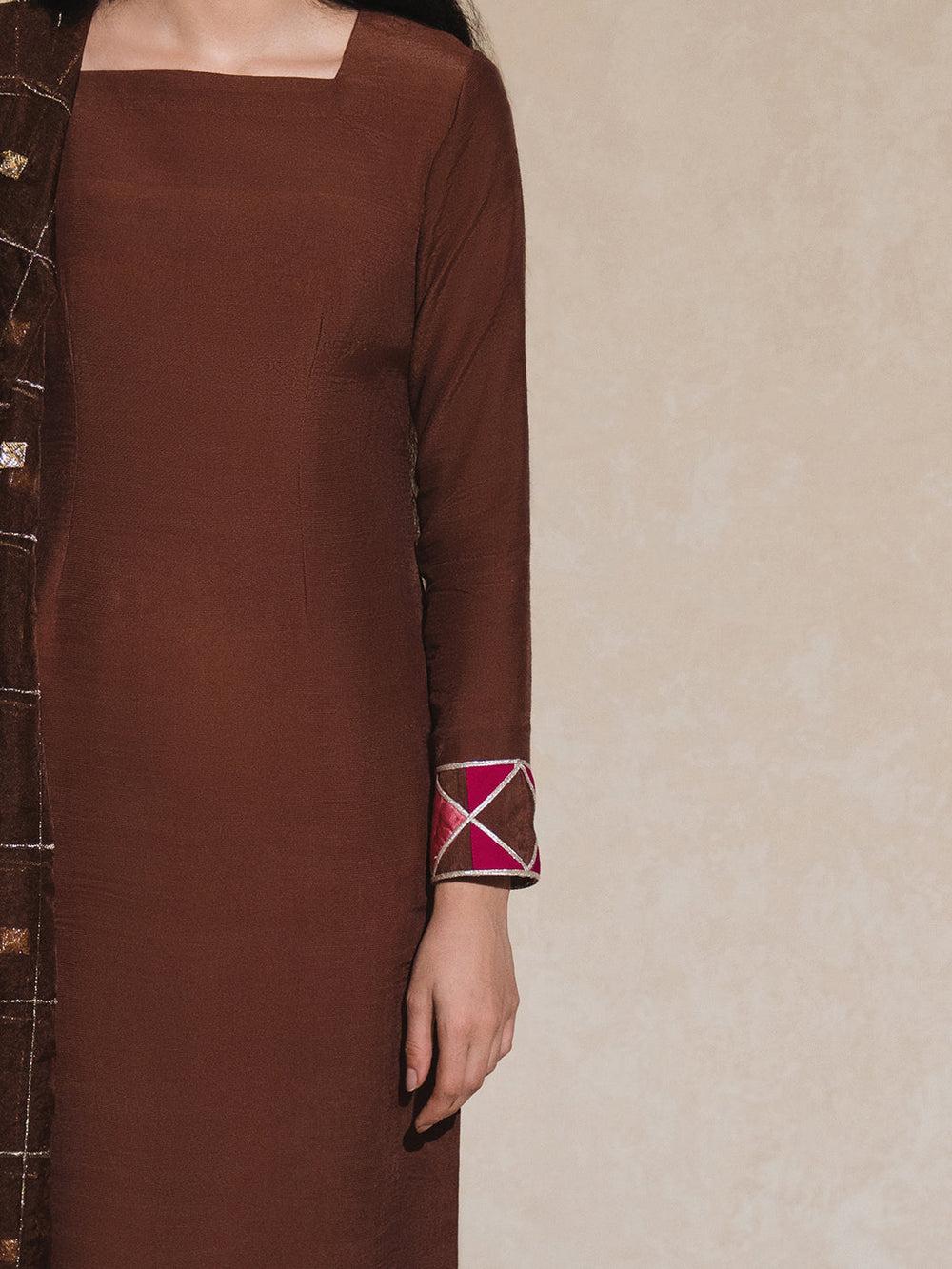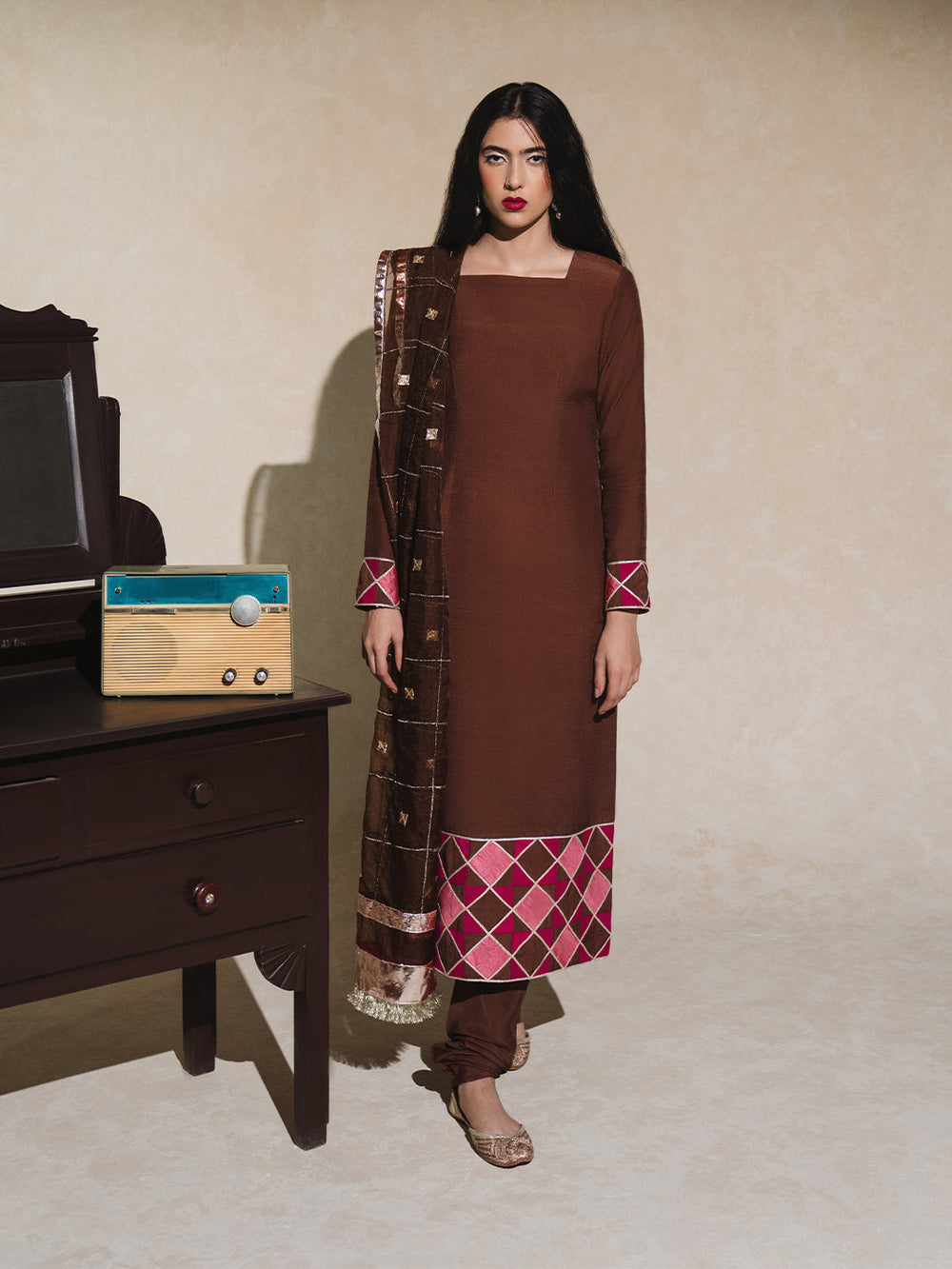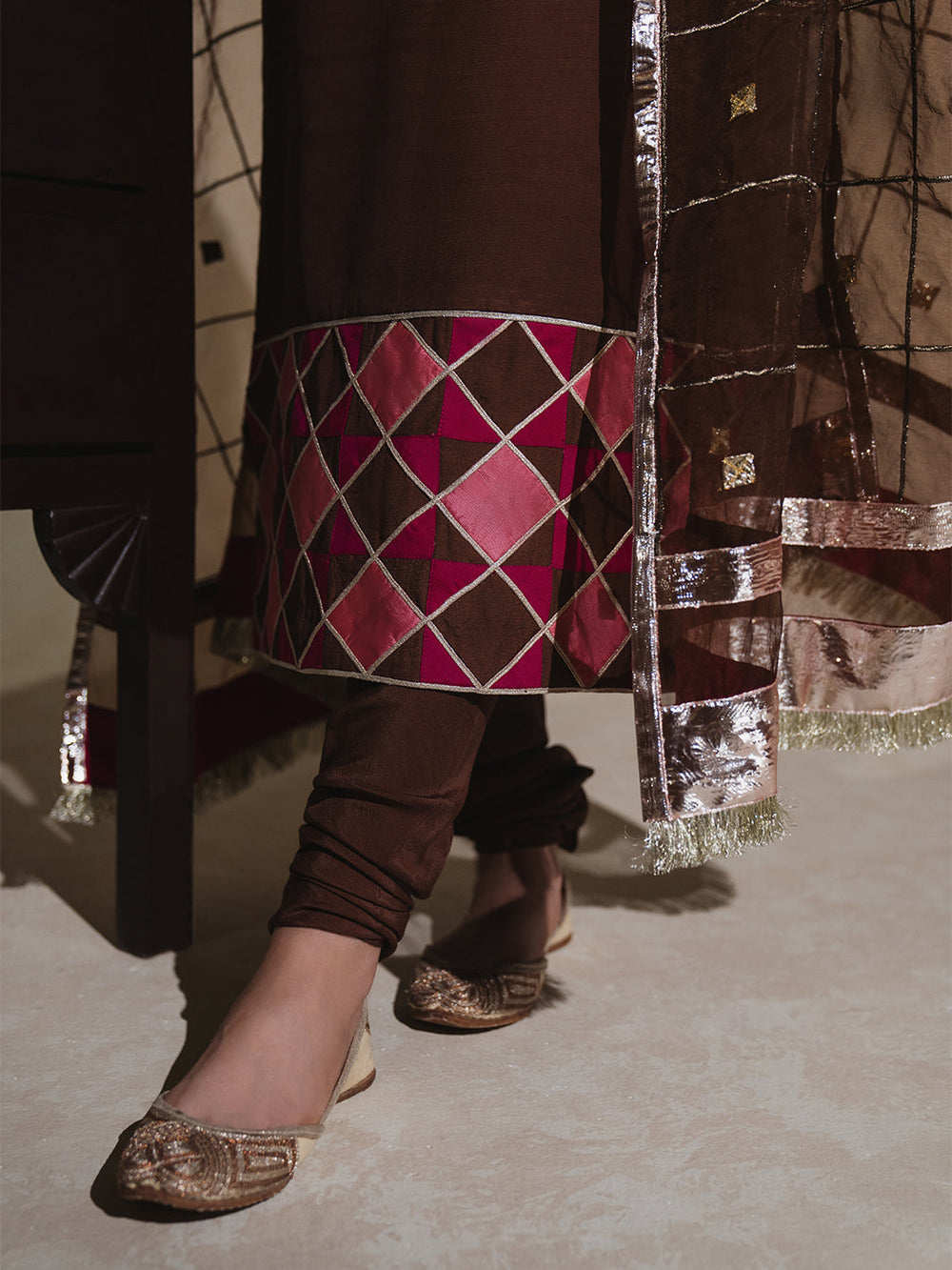 A deep jaiphal brown raw silk kameez with a choras neckline and long, structured cut, finished with hot pink barfi-style tukri gota in a chattapati-inspired layout along the daman and sleeves. Paired with a classic raw silk chooridar for a timeless, elegant silhouette. The look is tied together with a matching tillaydar organza dupatta, adorned with chikour embroidery, gulabi kinari, and chandni kiran — soft, nostalgic, and made to be remembered.