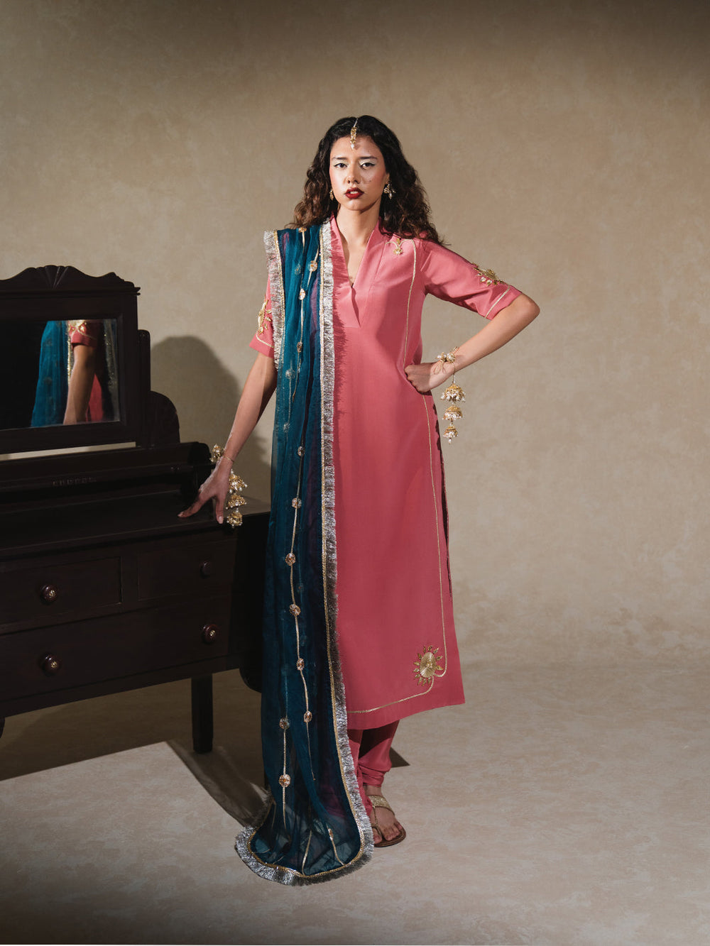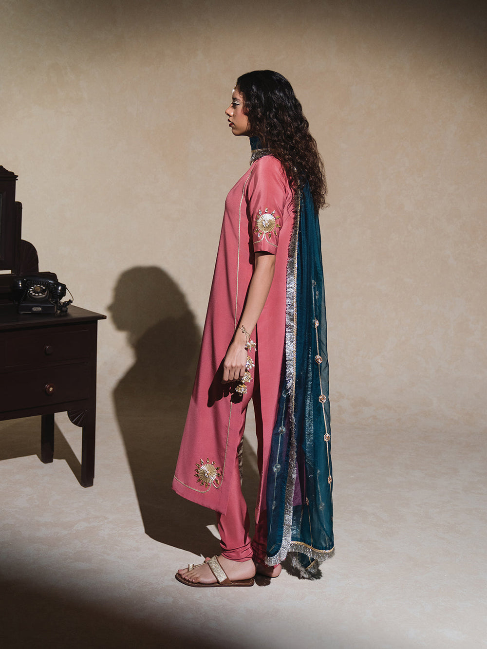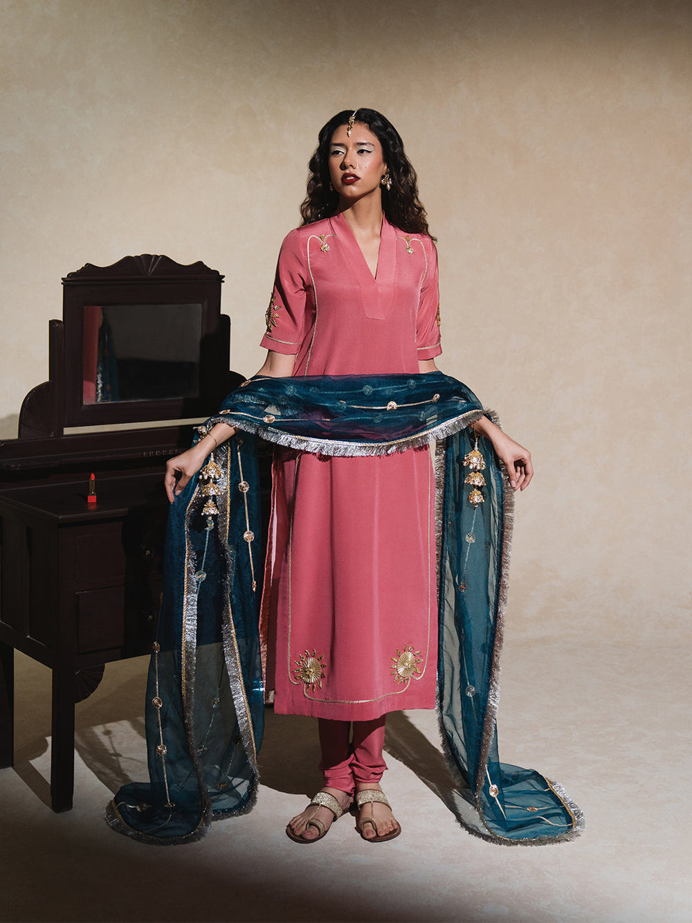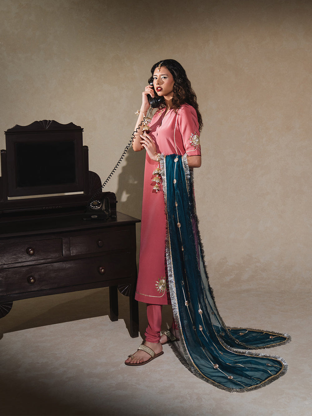 Gul-e-ashrafi pink grip kameez featuring a crisp talpat gala and half sleeves adorned with champa gota suraj motifs and tear-drop gota patti. Subtle silver lappa lines the inner slits for a hint of hidden shimmer. Paired with a fitted grip chooridar that grounds the look in timeless elegance. Finished with a shadab neela organza dupatta, scattered with gol gota and framed in gota kinari and rupahla kiran — a soft, heirloom-inspired ensemble made for celebration.