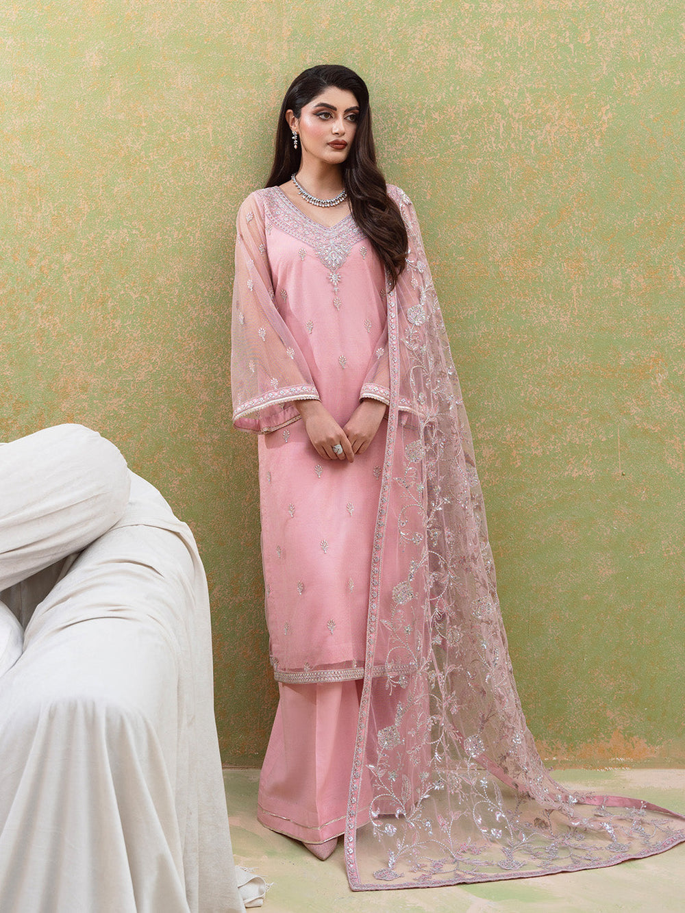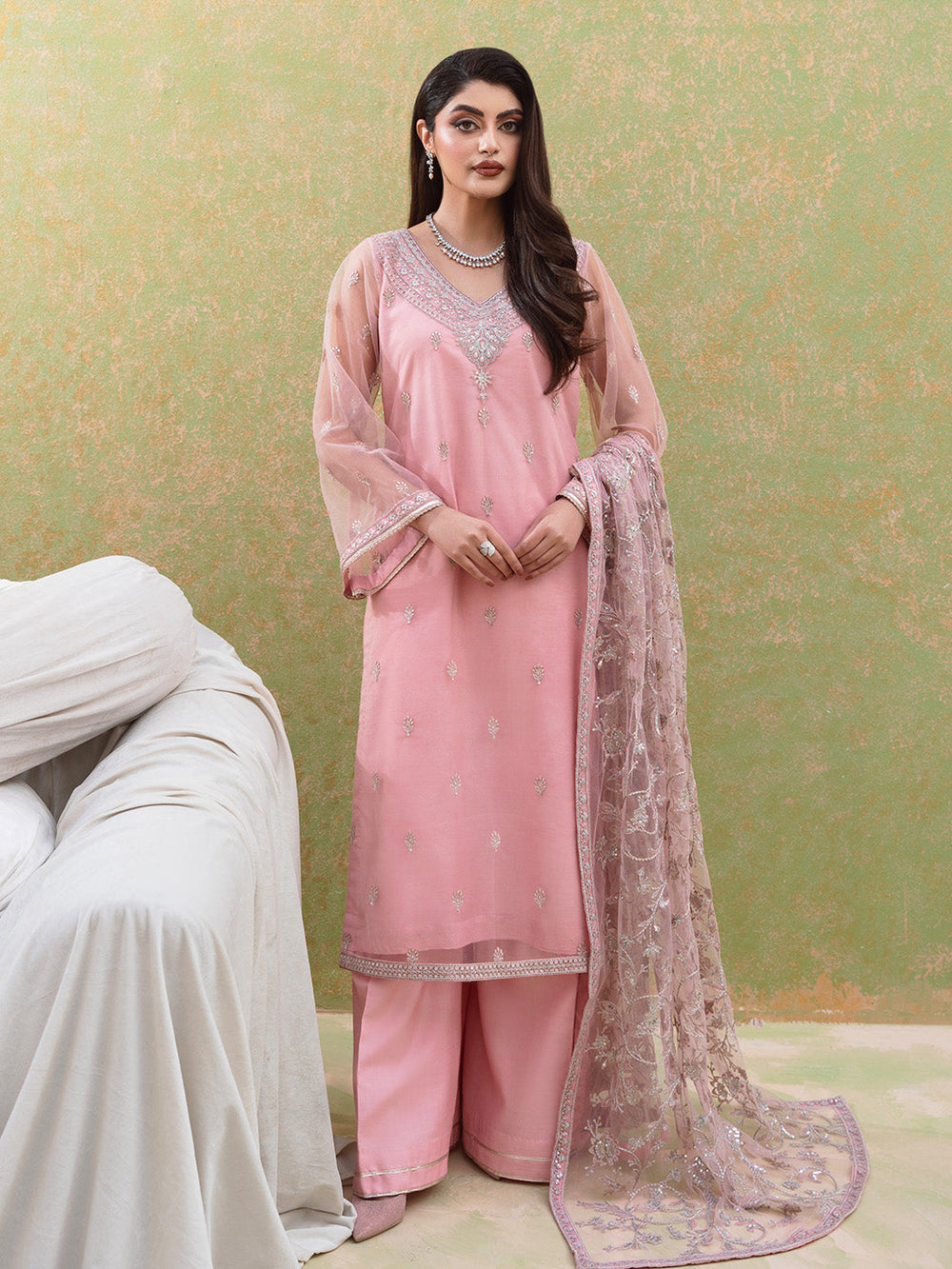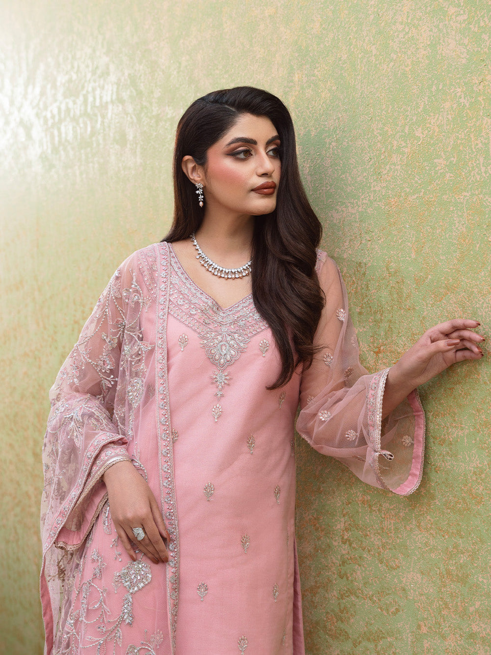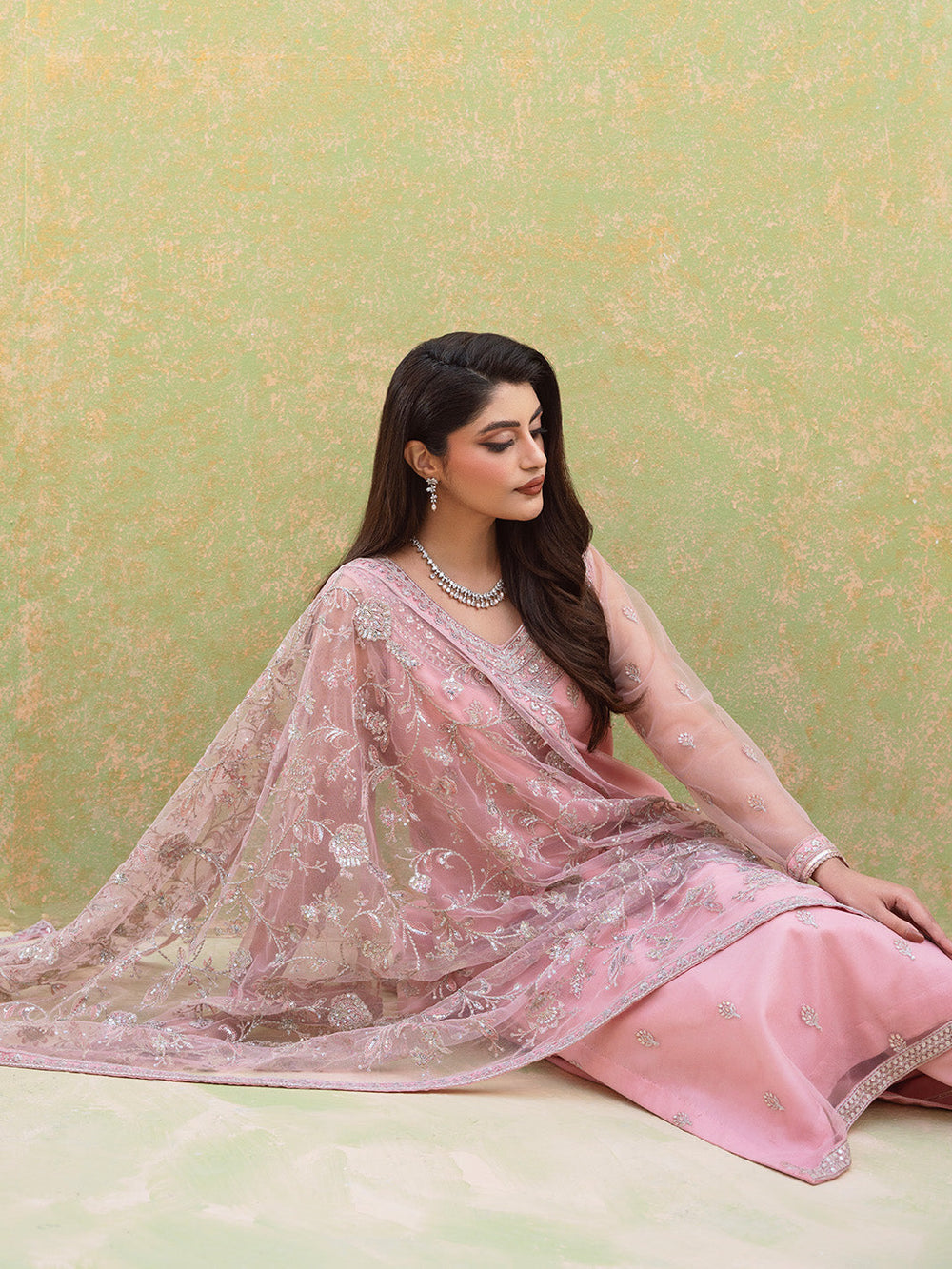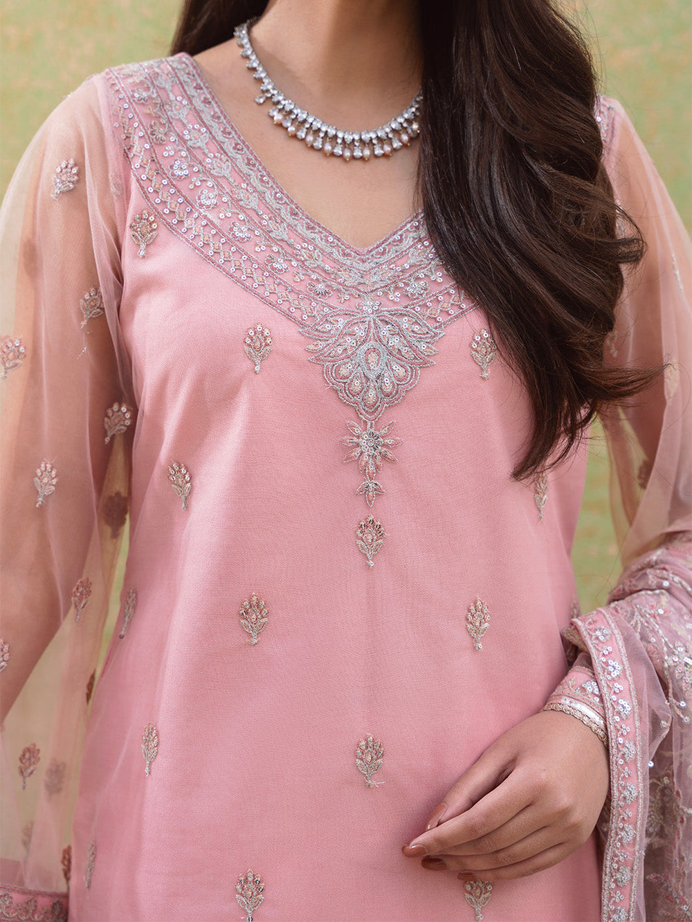 Unique powder pink ensemble with a light weight shirt and heavily embroidered dupatta.