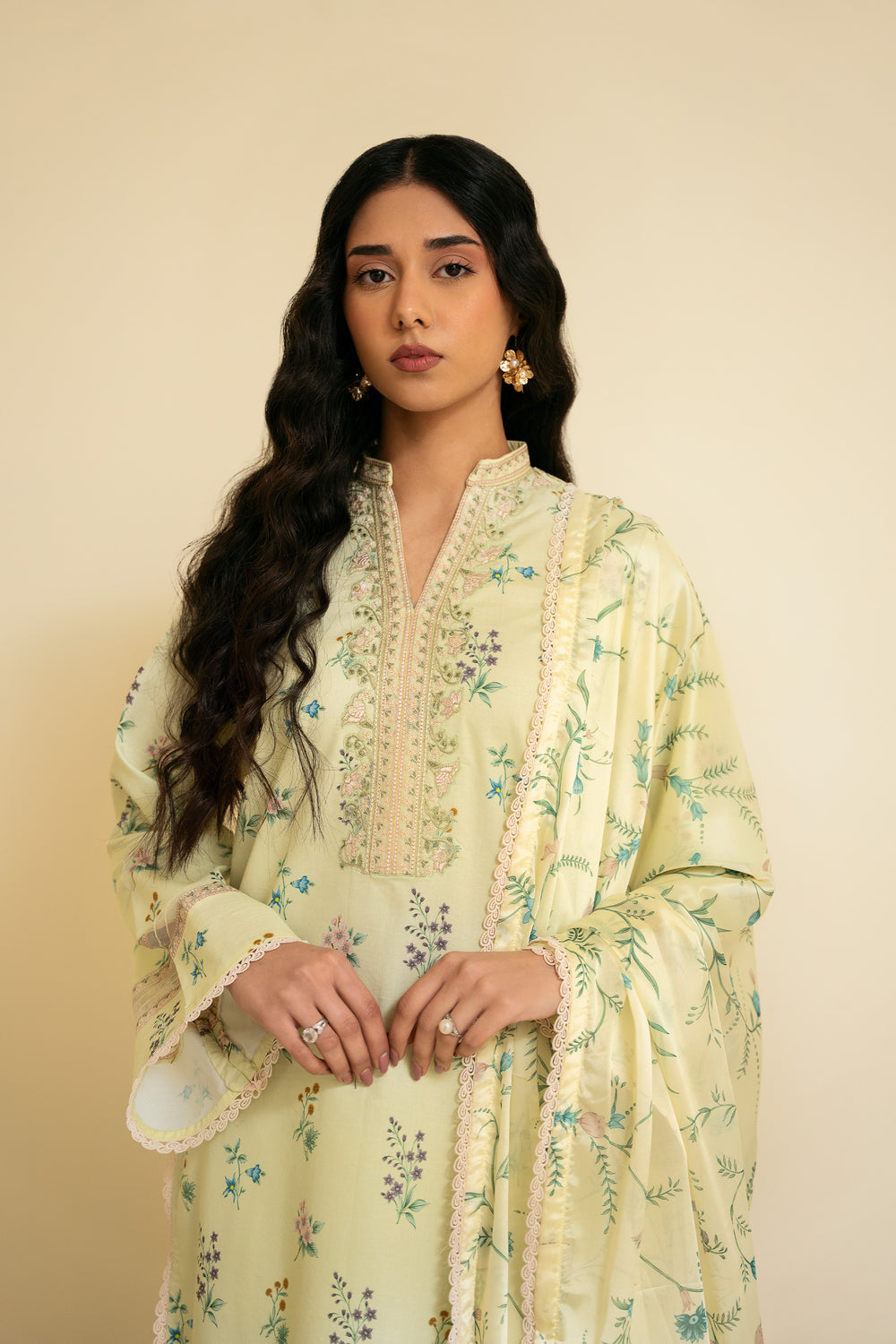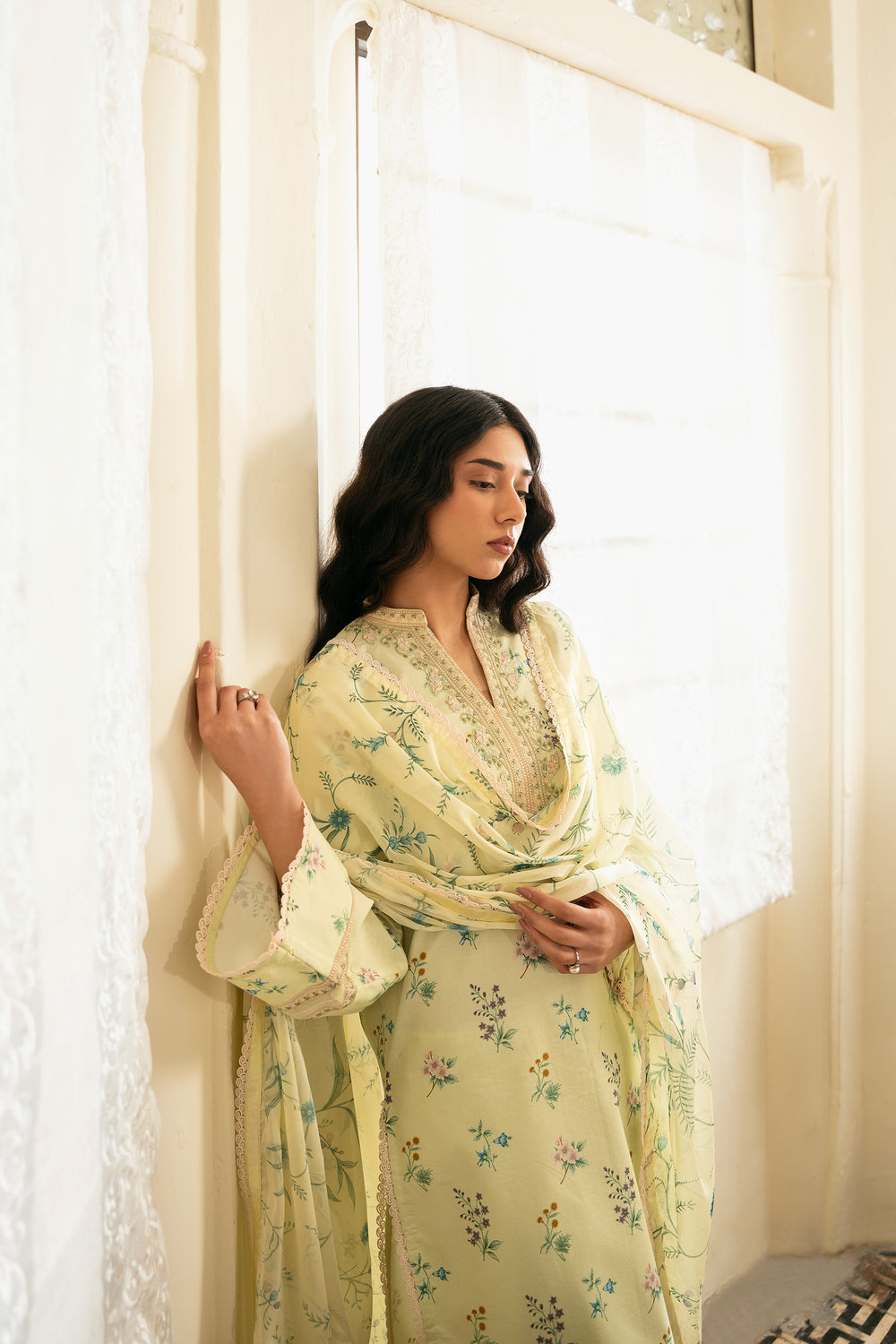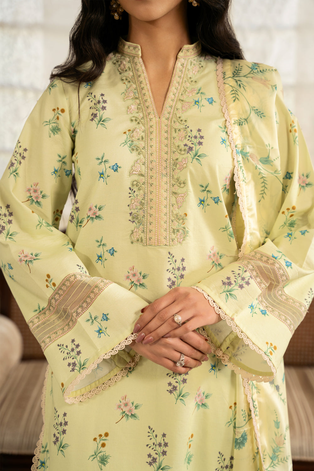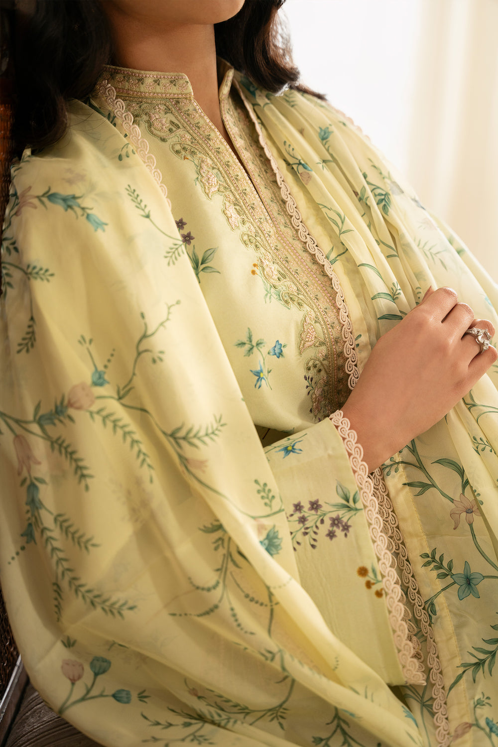 The dupatta features a lemon yellow silk base adorned with floral motifs that mirror the print on the shirt, creating a cohesive and harmonious look. The shirt is digitally printed with delicate florals and finished with embroidered patches along the neckline and sleeves for added detail. The trouser is kept plain in a matching dyed tone, allowing the design elements to stand out.