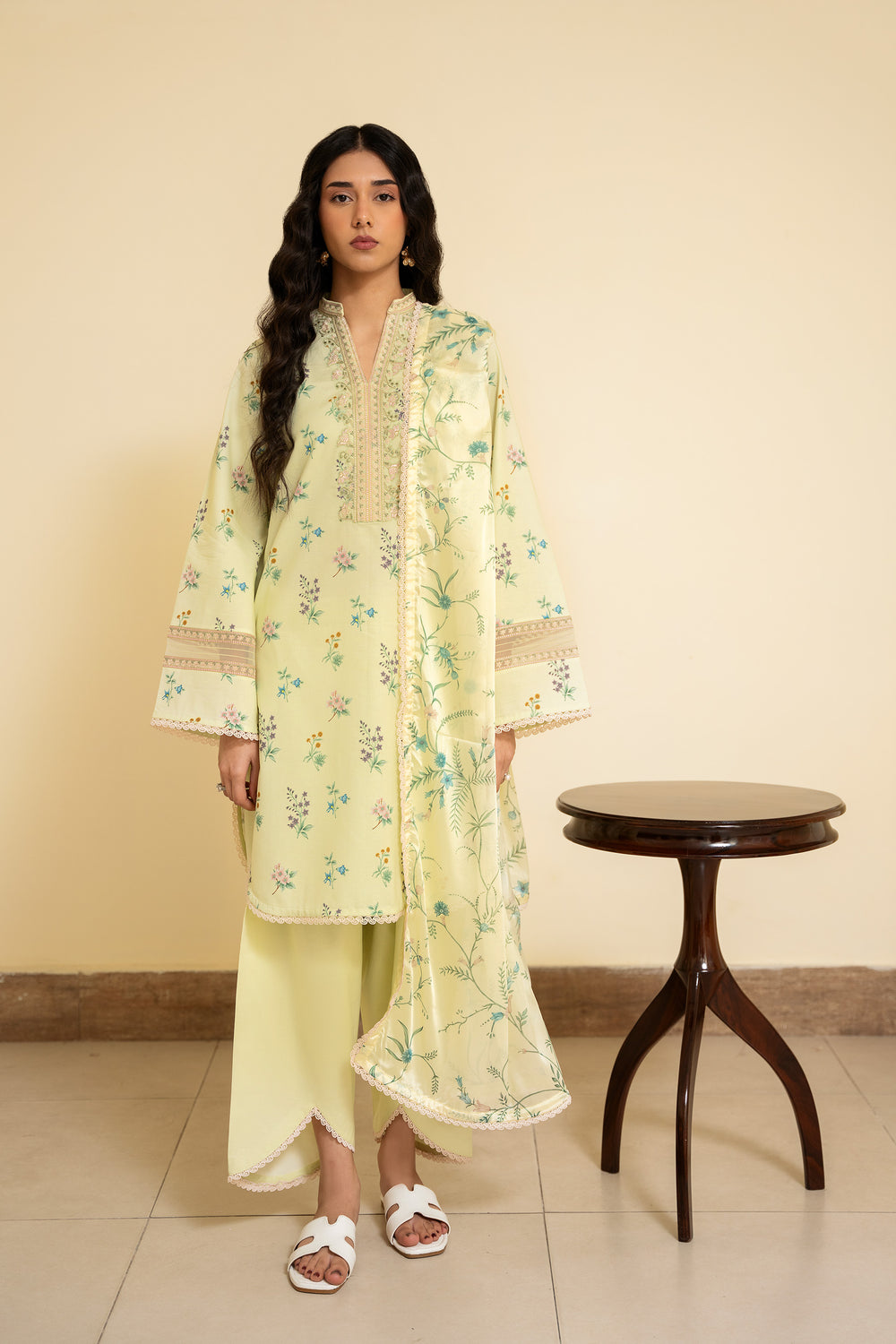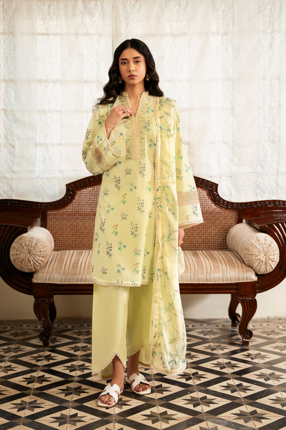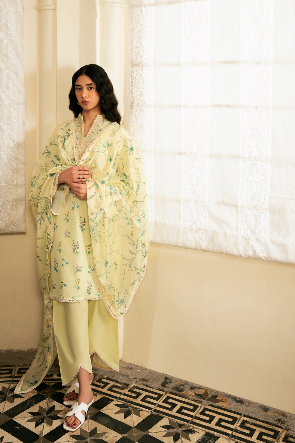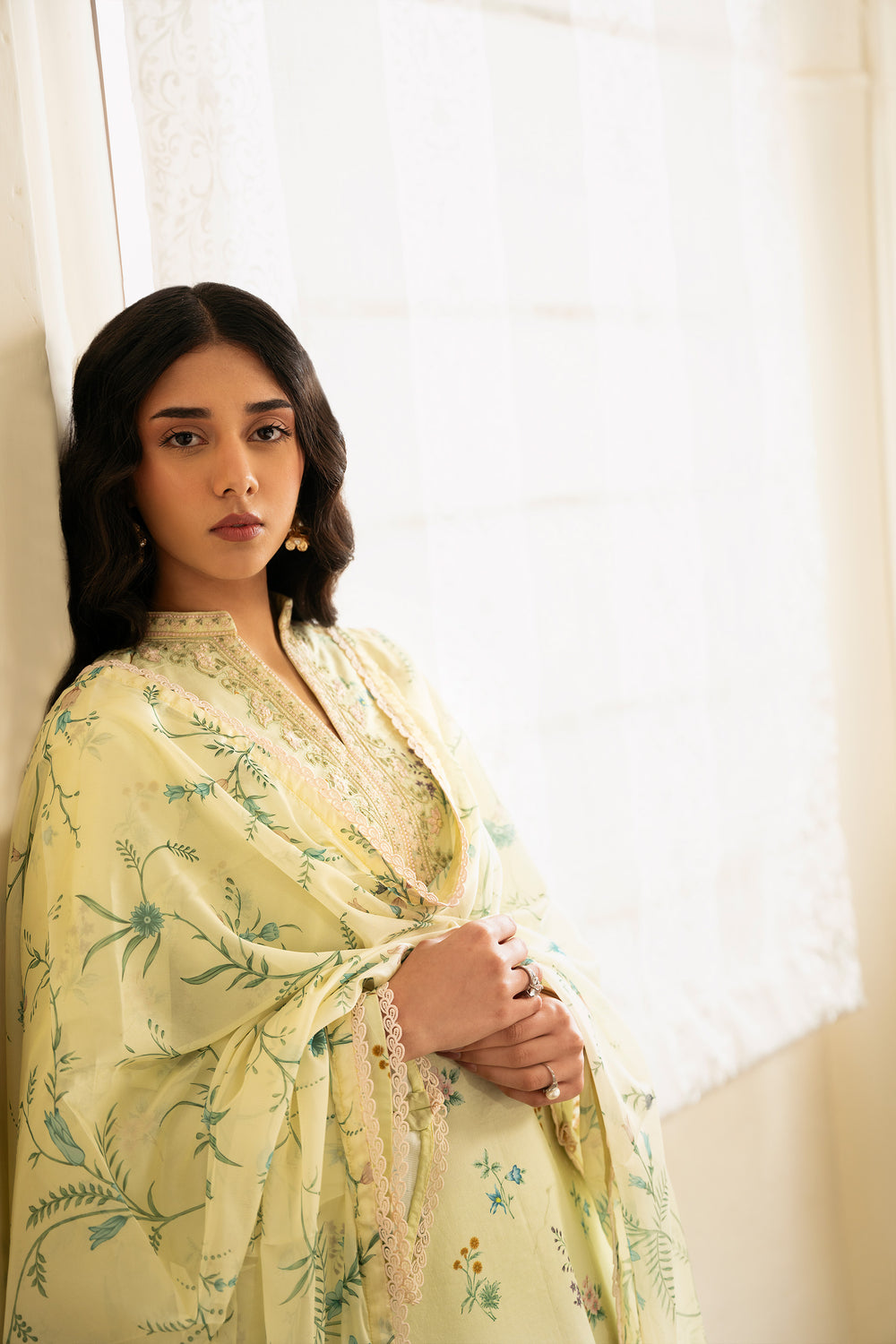 The dupatta features a lemon yellow silk base adorned with floral motifs that mirror the print on the shirt, creating a cohesive and harmonious look. The shirt is digitally printed with delicate florals and finished with embroidered patches along the neckline and sleeves for added detail. The trouser is kept plain in a matching dyed tone, allowing the design elements to stand out.