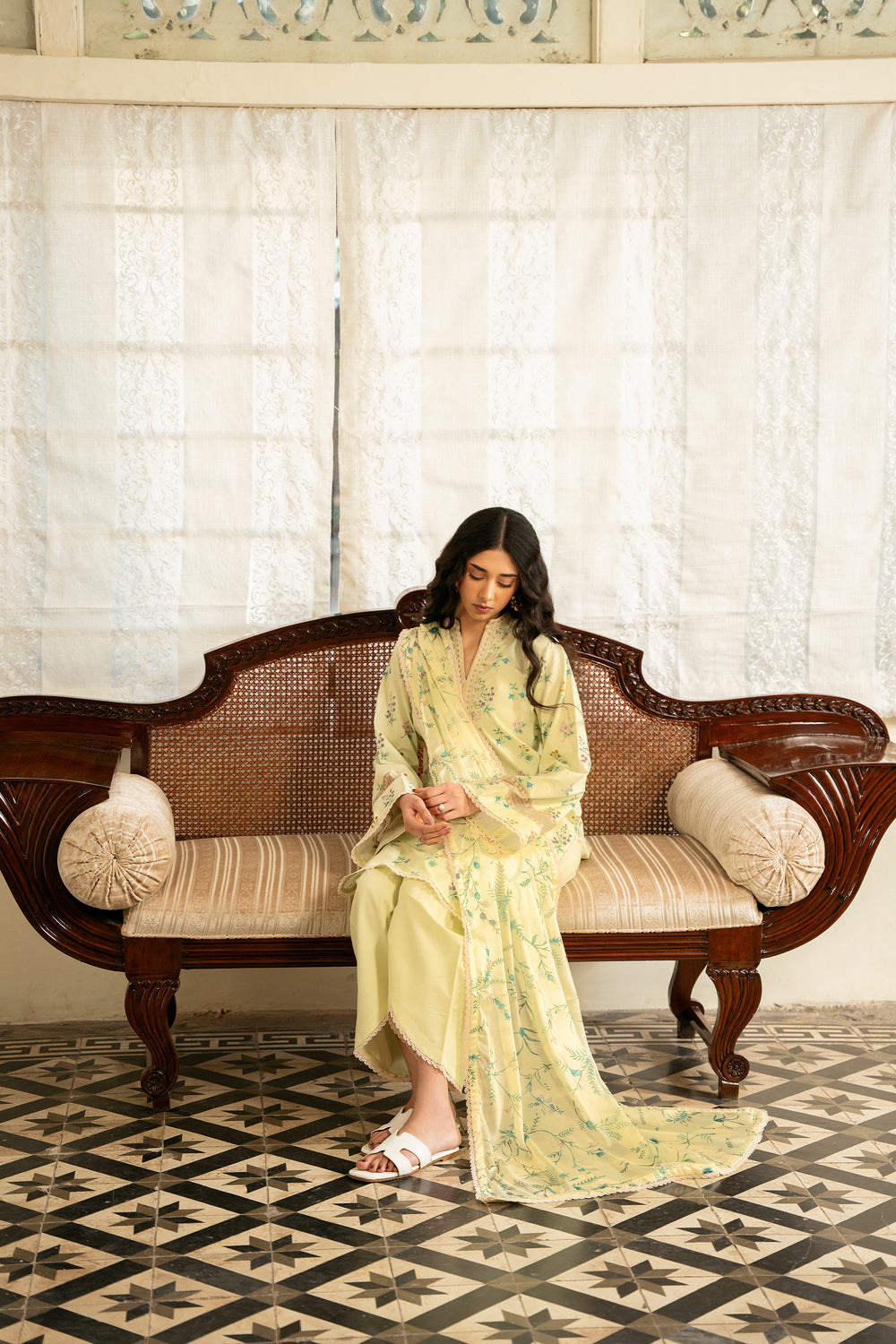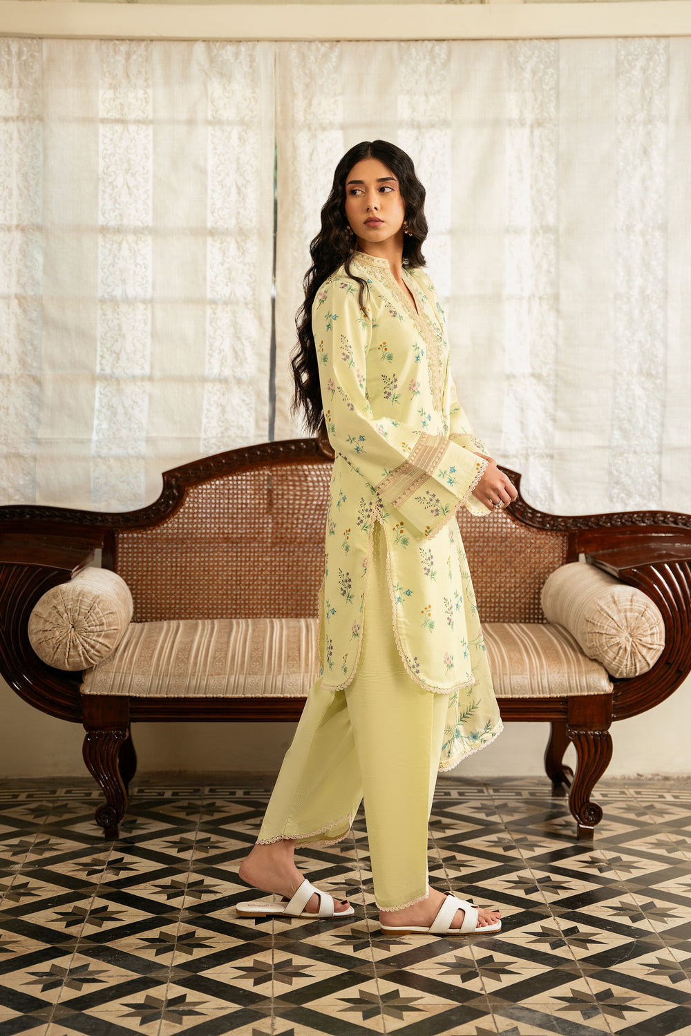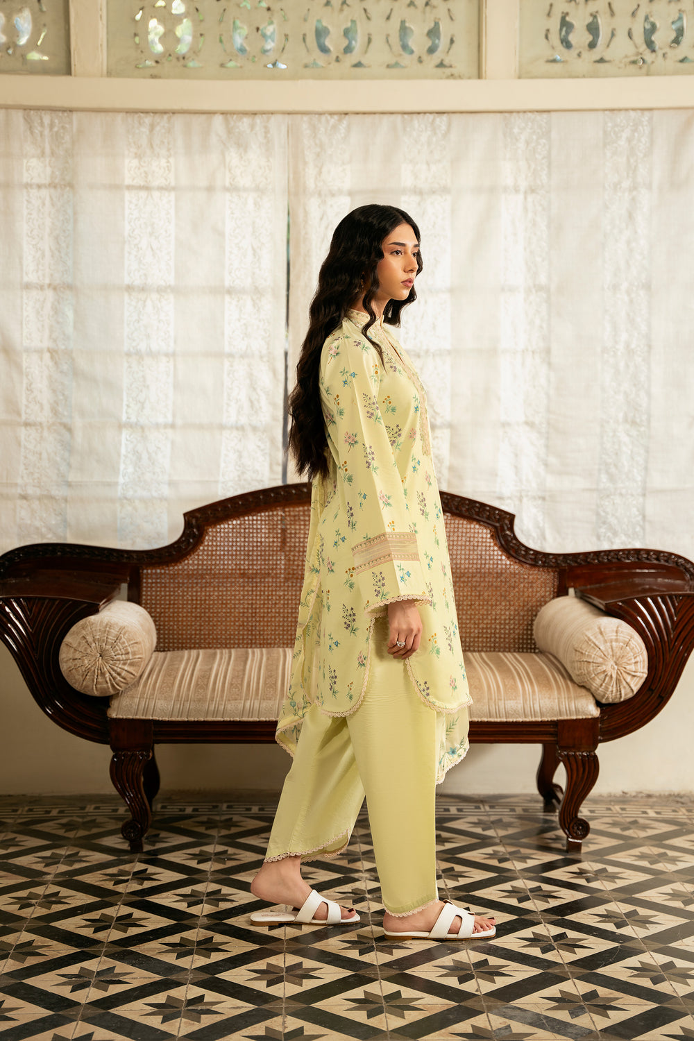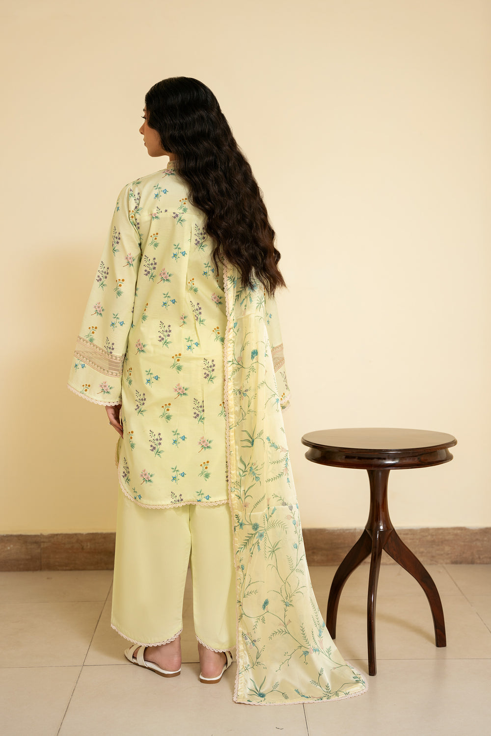 The dupatta features a lemon yellow silk base adorned with floral motifs that mirror the print on the shirt, creating a cohesive and harmonious look. The shirt is digitally printed with delicate florals and finished with embroidered patches along the neckline and sleeves for added detail. The trouser is kept plain in a matching dyed tone, allowing the design elements to stand out.